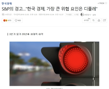 S&P가 대한민국의 금리를 0%대로 낮춰야한다고 발표를 했는데, 즉 일본의 금리처럼 제로금리 시대에 빨리 도입을 해야지만 경기가 살아날 수 밖에 없는 최악의 상황이라고 이야기합니다.