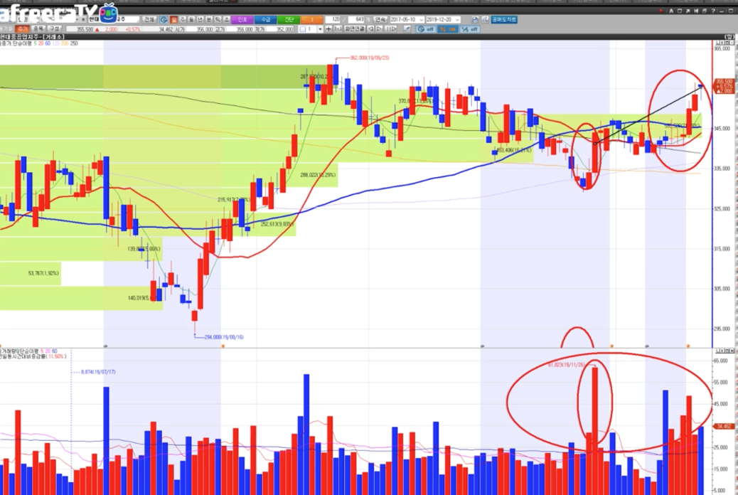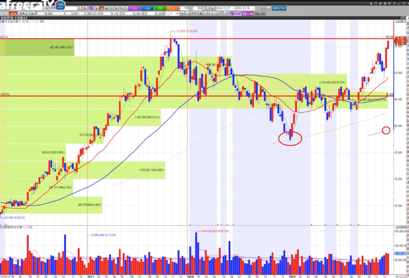 그런데 지난주 2주동안 랠리가 들어오면서 18일 종가 기준 56700원에 가격이 형성 되었습니다.