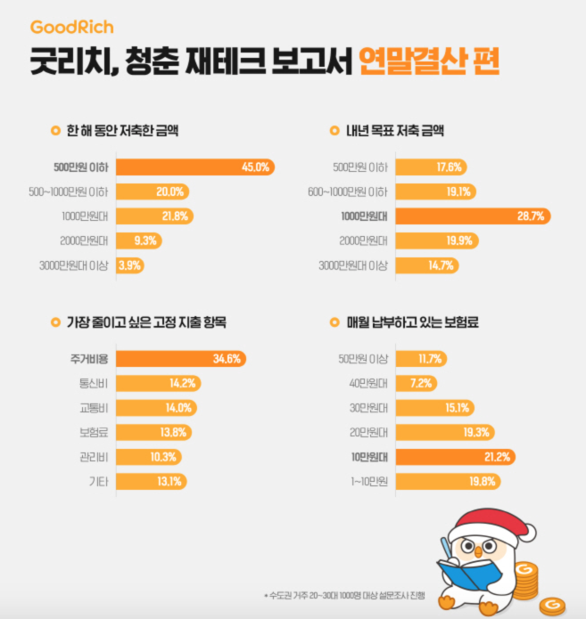 조사 대상이 굿리치라는 보험 플랫폼을 사용하는 청년층임에도 불구하고, (어느정도 돈에 대해 아예 관심이 없는 사람들은 아니겠죠)
