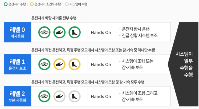 참고로 레벨2가 차선이탈을 하면 경고알림을 해주는 수준입니다. (차선 검출 기술을 통해 하겠죠?)