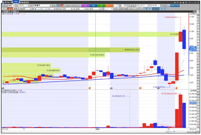 수요일 6500원이 조금 넘는 종목이 갑자기 10900원까지 갔다고 합니다.
