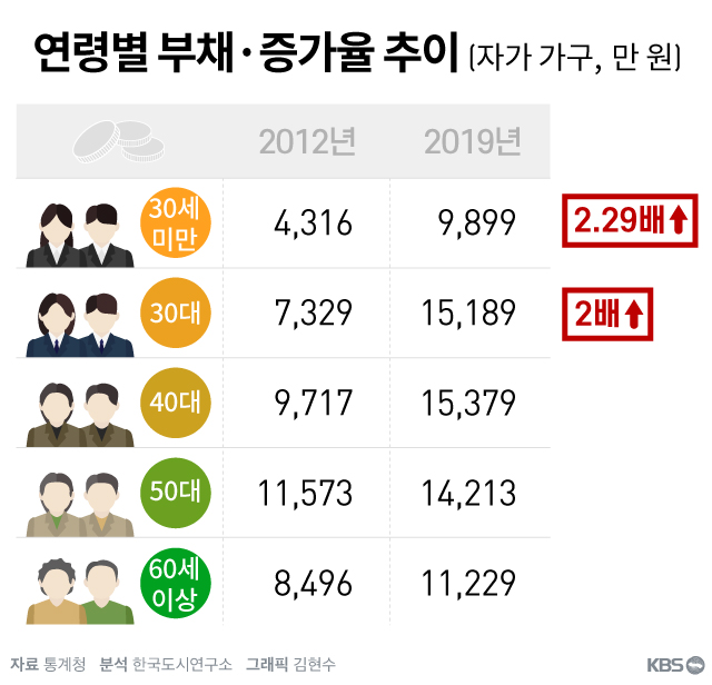 부채 증가율을 보면 30대 미만이 2.29배로 가장 높습니다.