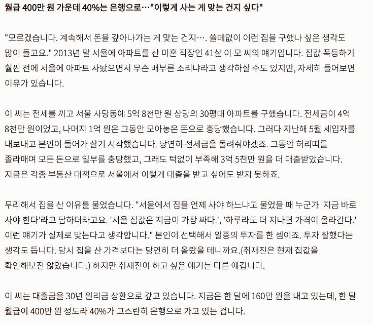 월급 400만 원 가운데 40%는 은행으로…"이렇게 사는 게 맞는 건지 싶다" "모르겠습니다. 계속해서 돈을 갚아나가는 게 맞는 건지…. 쓸데없이 이런 집을 구했나 싶은 생각도 많이 들고요." 2013년 말