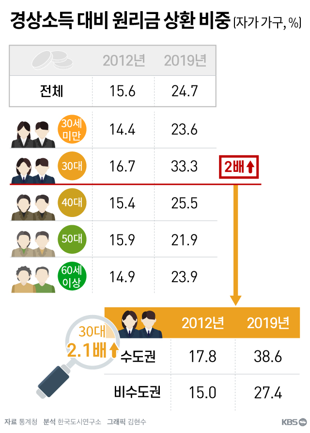 30대의 원리금 상환비중은 2012년도 16.7%에서 2019년도에 두배로 늘었습니다.