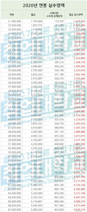 출처: 취업대학교 이는 2020년도 기준 연봉 실수령액입니다.