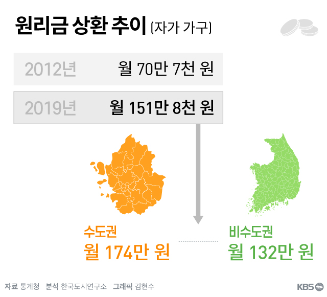다음의 통계는 빚의 크기가 아니라 집을 가진 가구가 매달 갚는 이자와 원금이 얼마나 되느냐입니다.